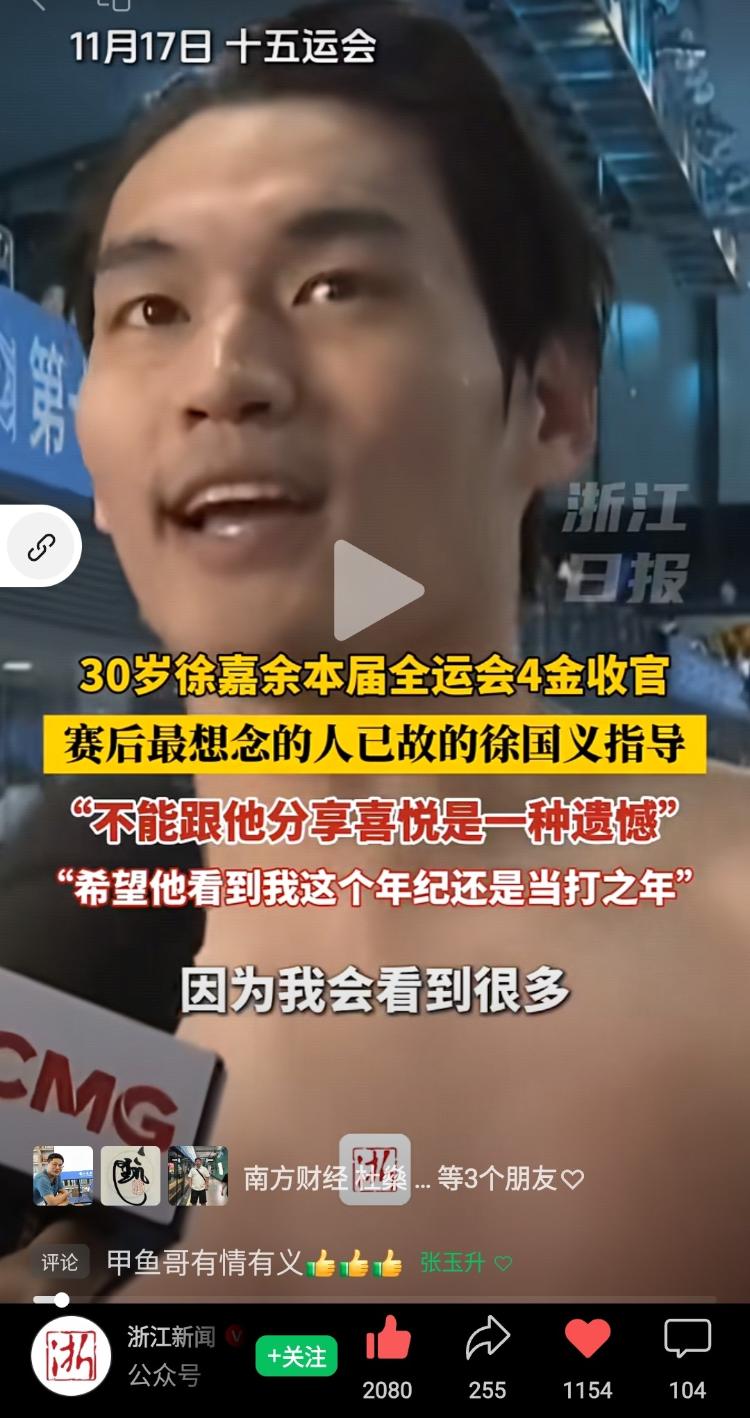 新闻海报记者张玉生在前线撰文:11月9日至21日,第十五届全运会(以下简称十五运会)在粤港澳大湾区举行。我参与了整个全国比赛的报道。这段时间,我亲身经历了很多有趣的故事,现整理记录下来,以纪念这两周的十五运会。 ——乌龟有爱心,有正义感; ——朱雨玲,为数不多的具有高思维水平的运动员之一; ——十五运会最美好的话语:我用青春,成就了自我实现的梦想; ——苏神眼中的比赛,第十五届全运会给了苏炳添极大的荣誉……经过近两周的努力,第十五届全运会已经结束。马希吉特从全国各省区37个代表团14000名运动员中脱颖而出,经历了激烈的角逐,留下了一串串闪亮的名字——张展硕、陈宇杰、于子弟、柯勤勤、崔晨曦、张子宇、刘子涵……苏炳添、马龙、巩立姣、陈梦、孙、孙、孙、孙、王顺、郑思维、黄雅琼……全运会永远是体坛新生力量的第一朵花,也是老将的最后一舞。有的人如愿赢得金牌,名声大噪;有些人带着遗憾离开,带着悲伤离开。全运会舞台既是比赛的舞台,也是人生的舞台。对我来说,体育本来就不是我的报道领域。这是我第一次跨界报道全运会,也可能是最后一次。回顾我12天的十五运会报道生涯,我在大湾区多个城市的多个地方见证了8枚金牌、6枚银牌的诞生。我不仅写了胜利者的荣耀和解放,也记录了战败者的遗憾和悲伤。由于工作原因,正在忙着关注每天都有比赛项目,很少有时间去考虑全国比赛的大局。好在现在短视频发达了,我偶尔可以在手机上浏览看看精彩的活动。回顾我的个人微信朋友圈,整个十五运会,我不小心留下了四条个人评论。这是本文开头的四段。第一段是徐嘉余大喊大叫,人称“龟哥”。 11月18日,《浙江新闻》发布视频:30岁的徐嘉余以4枚金牌完赛全运会。赛后他想念的人是徐国义的迟到指导。本次全运会,徐嘉余包揽男子仰泳项目全部四枚金牌,实现全运会100米仰泳“四连冠”。他感慨道:“看到舜哥(王舜)有朱导演,我很遗憾没有人分享这份喜悦。和;希望这个年纪还能看到他风华正茂……”他的发言感动了包括我在内的万千网友,我立即在视频下留言:龟哥有情有义。短短几天,这条留言就收到了一百多条祝福和建议。第二段是关于乒乓球运动员朱雨玲的。众所周知,作为国乒前主力,朱雨玲在2020年遭遇重病,不得不退出乒坛。身体恢复后,她于2022年申请进入中国电子科技大学攻读管理学博士学位。如今,取得澳门居民身份后,她代表她再次前往澳门参加乒乓球比赛,并在第十五届全运会上获得女子双人第四名。“相比打乒乓球,我更想当一名老师。教师可以是一个活生生的职业。”十五运会期间,朱宇凌在接受腾讯体育采访时说道。 “他的导师告诉他,不要开除自己,也许你的乒乓球事业会被耽误……”涅槃重生的朱雨玲戴着眼镜走进球场,语气平静,话语颇有名气。有网友评价:“朱雨玲的名气越来越大了,她思想深刻,敢于面对强敌,敢于面对生活,能够清晰地选择和承载,做什么事情都取得了成就。就思想境界而言,她达到了大多数运动员无法达到的高度。”第三段是关于第十五届全运会百米栏冠军刘景阳的。近几天来,刘景阳的走红与争议,以及关于“他没有教练”的争议与澄清,成为热门话题。 网络话题 11月19日晚,刘景阳夺冠时,我心情复杂,准备采访另一位选手。老奖牌获得者。不幸的是,我错过了比赛。突然,数量空前的记者涌入混合矿区,站着采访吴燕妮。我进不去,就问媒体同事:“吴燕妮夺冠了吗?”有人回答我:“不是,吴燕妮得了亚军。”这才知道,名不见经传的刘景阳爆冷战胜了赛前夺冠热门吴燕妮。后来,当我看到他的赛后演讲“我用青春成就了自己的梦想”时,我立即转发到我的个人朋友圈,并称其为“十五运会最好的演讲”。后来,认识的还有一些广州电视台的记者。刘景阳妈妈在看台上的感人话语,出自广州电视台女记者之口。我毫不犹豫地表达了我个人的欣赏和赞扬,“这次随机采访,我认为是整个十五运会最好的采访。如果分数是100分,我会给120分!”好吧,最后来说说苏炳添。11月20日晚,我亲眼目睹了苏炳添的谢幕,亲眼目睹了现场7万到8万人海啸般的呐喊,完整地拍下了苏炳添的百米跑全程,以及他挂靴后的讲话。当时我就站在苏的正上方冰天的起跑位置,与他直线距离只有100米左右,有趣的是,当他鞠躬起跑,观众兴奋不已时,我忍不住向旁边的媒体同事预测,“是很快就会发生的事情……”可惜我在第一次交接时就出现了失误,最终广东队获得了男子4×100米接力的第四名。更有趣的是,苏炳添说完退出赛场后,我随机把他演讲的最后30秒发到了我的个人视频账号“Badmi”上。看台上的“右手”,然后我就忙着追采访者。当我结束采访,抽出时间打开个人视频账号时,“见证苏炳添赛场告别”的短视频居然吸引了上百个点赞。和这篇文章的发布一样,这个30秒的未经剪辑的视频给我带来了近5万的浏览量,吸引了上百人的关注。我开玩笑说,谢谢苏炳添给我毁天灭地的流量 11月20日晚上,我见证了苏炳添的谢幕。